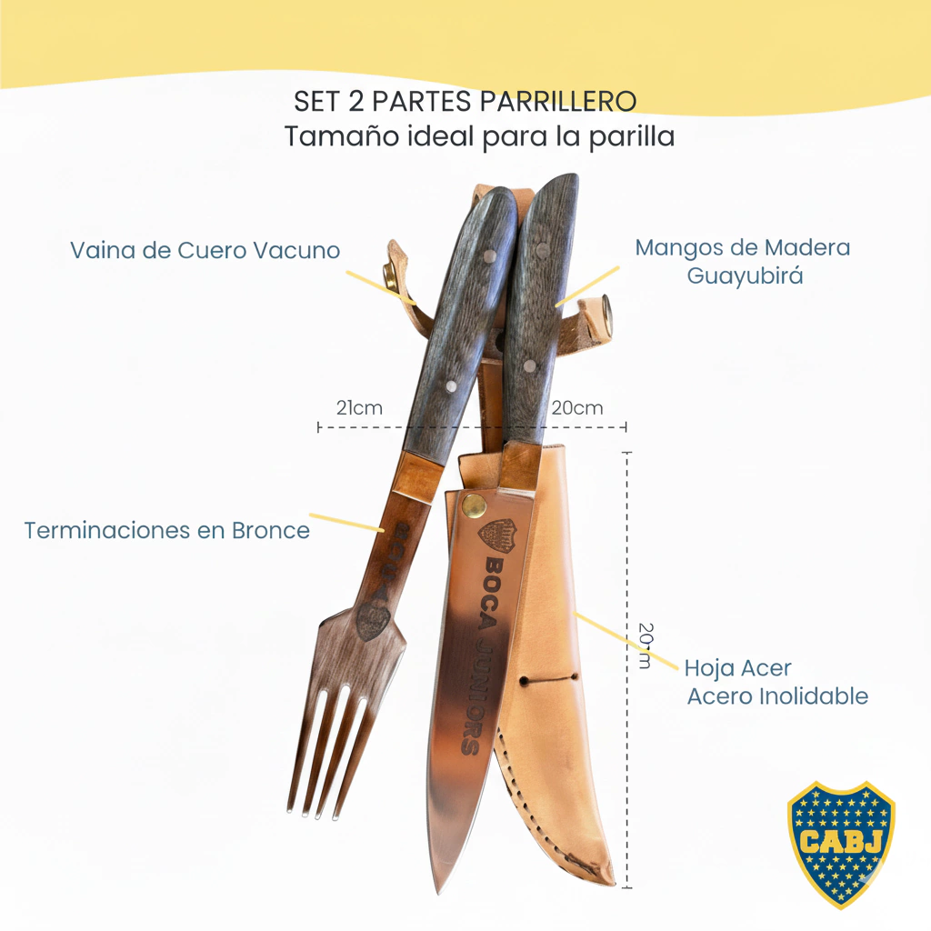 Los cubiertos, con una longitud total de 24 cm, poseen un cabo de madera con detalles en botones de bronce que brindan elegancia y resistencia. Las hojas están hechas en acero inoxidable de primera calidad, garantizando durabilidad y un corte perfecto. Además, vienen acompañados con su vaina de cuero para protegerlos y facilitar su transporte.