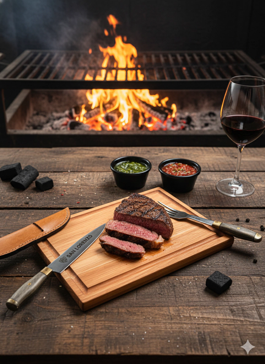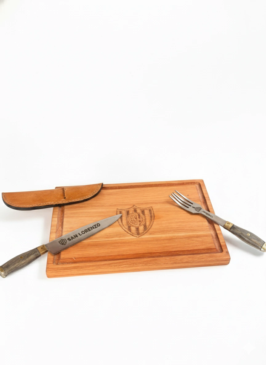 Disfrutá de tus momentos de asado con este exclusivo combo que incluye una tabla plato y un set de cubiertos aluminio forrado en silicona con el escudo deL CUERVO especialmente diseñado para los fanáticos de SAN LORENZO .