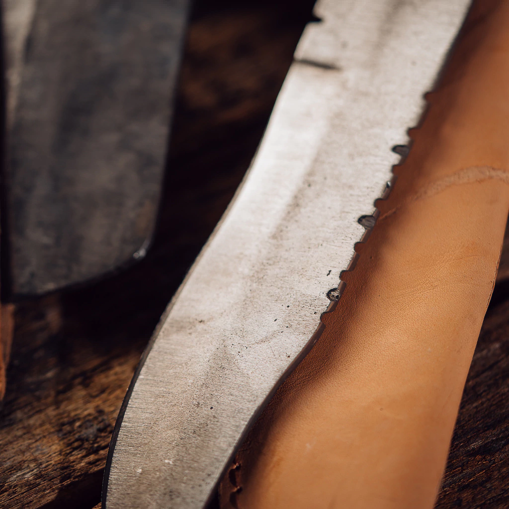 Cuchilla de 24 cm de hoja de disco de arado con un elegante estilo Bowie y un agarre de madera. Perfecta para cortar carnes con precisión y estilo.