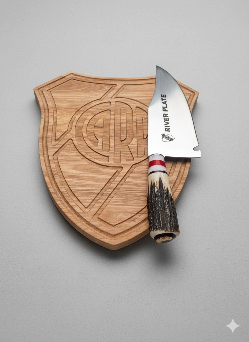 Disfrutá del asado con la elegancia y la pasión de River Plate en cada corte. Este exclusivo combo incluye una tabla de asado oficial con el escudo de River Plate y una cuchilla parrillera estilo Bowie, diseñada para los verdaderos fanáticos del asado y del Millonario.