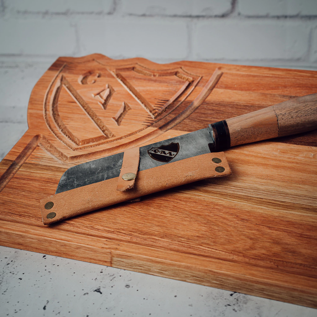 🔪 Incluye un HACHA parrillero excepcional: - Hecho con hoja de disco de arado de 16 cm. Este cuchillo no solo es funcional, sino que también está grabado con el escudo aportando un toque único a tu kit parrillero. - Además, viene con una vaina que asegura su protección y durabilidad.