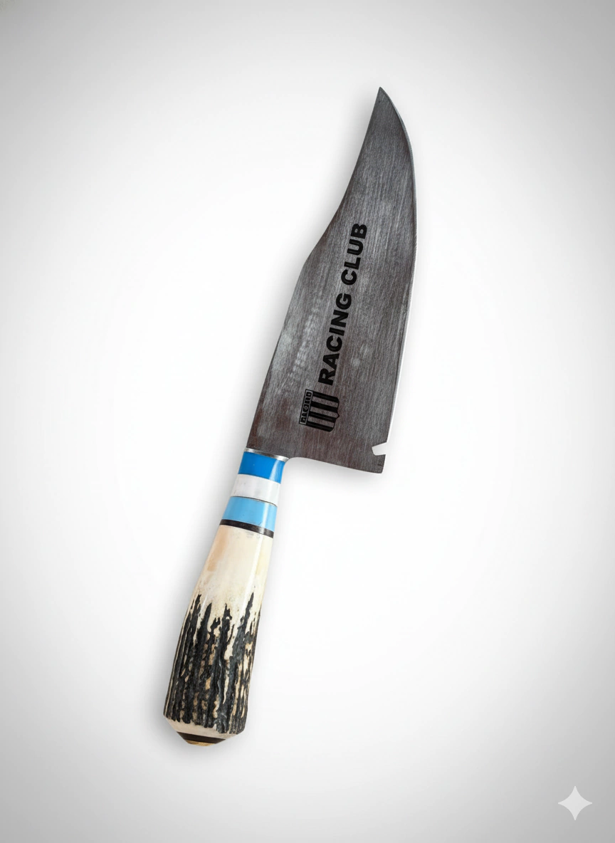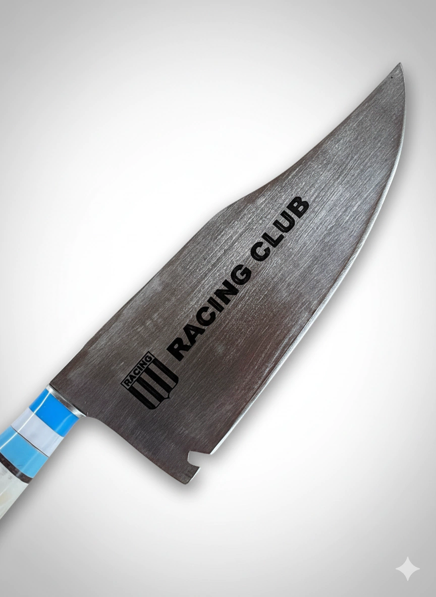 Una joya para tu asado: cuchilla de hoja de acero inoxidable de 24 cm de largo, con un diseño robusto y elegante típico del estilo Bowie. Su mango de ciervo con detalles en bronce y acrílico no solo aporta una estética sofisticada sino también un agarre cómodo y seguro. Además, esta cuchilla viene personalizada con los colores de RACING y su nombre grabado a fuego, un detalle que la hace inconfundible. Con una longitud total aproximada de 34 cm, es ideal para cortar grandes piezas de carne con precisión y estilo.